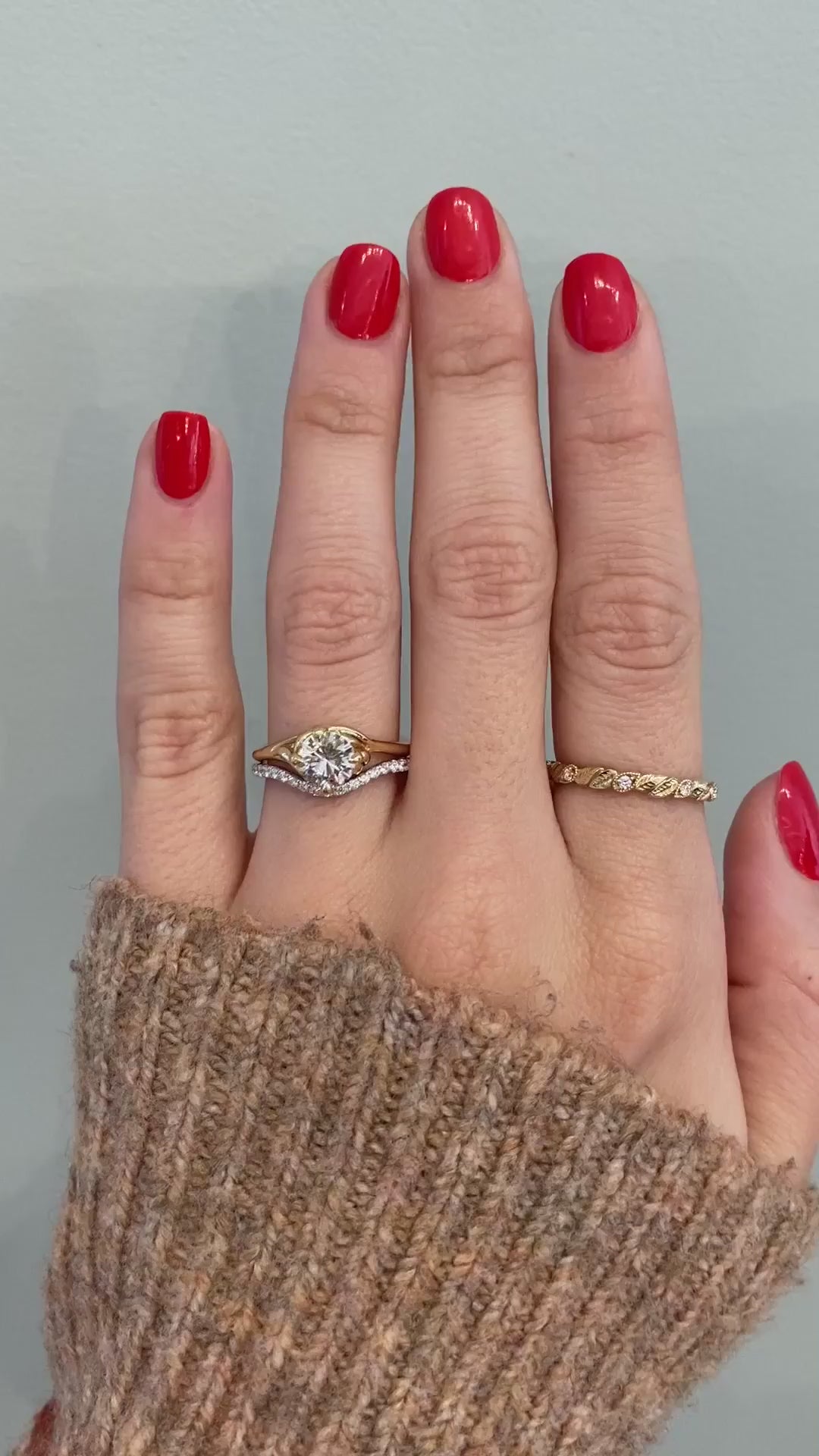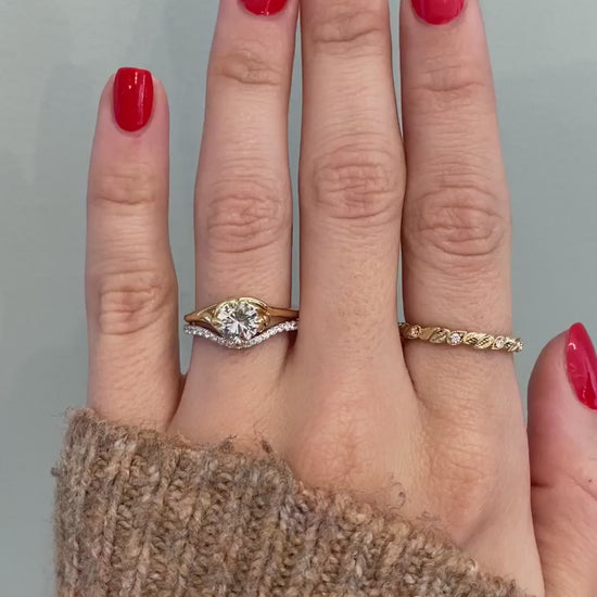 The Kalyssa combines the art of sculpture with a classic solitaire in your choice of recycled metal. A brilliant round diamond is encircled by sculptural arcs and set in a organic 4-prong setting.