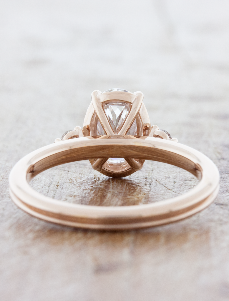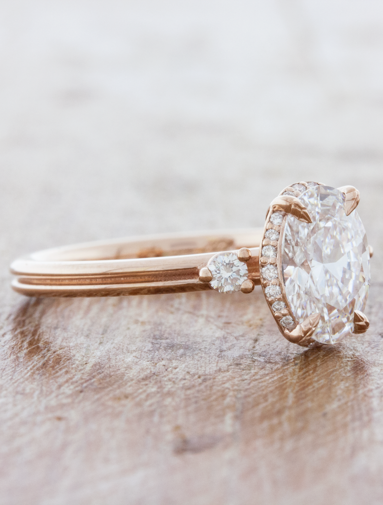 A brilliant 1.26ct D color VVS2 clarity oval cut diamond sits atop the 14k rose gold band guarded by four handcrafted leaf like prongs. We then sprinkled some diamonds along the ring's gallery to give it extra sparkle and a peek-a-boo halo and two bright white accent diamonds. The finishing touch was to make a double band  - one complete circle for each person making the promise of love.