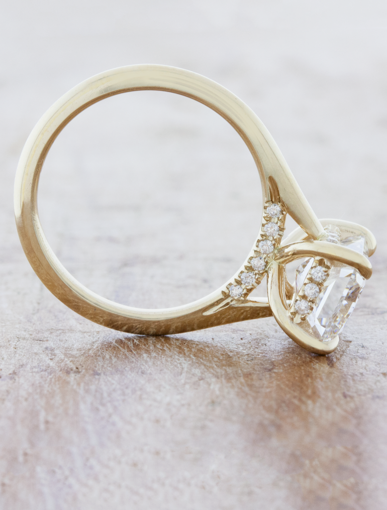 Kendall is a striking beauty that holds a radiant cut diamond, that is just that- radiant!  The bridge of hidden diamonds and tucked away hidden halo adds extra sparkle to her minimalist 14k yellow gold cathedral setting.  The center stone is an elongated E color VVS2 clarity lab grown radiant cut diamond that shines like no other.