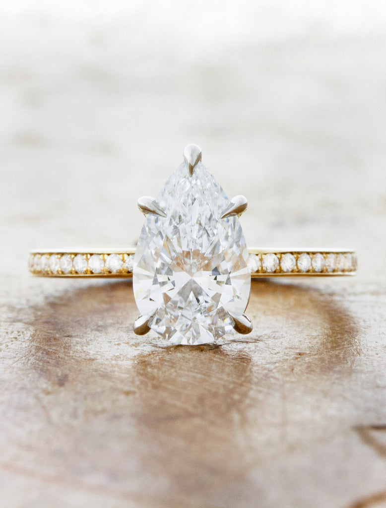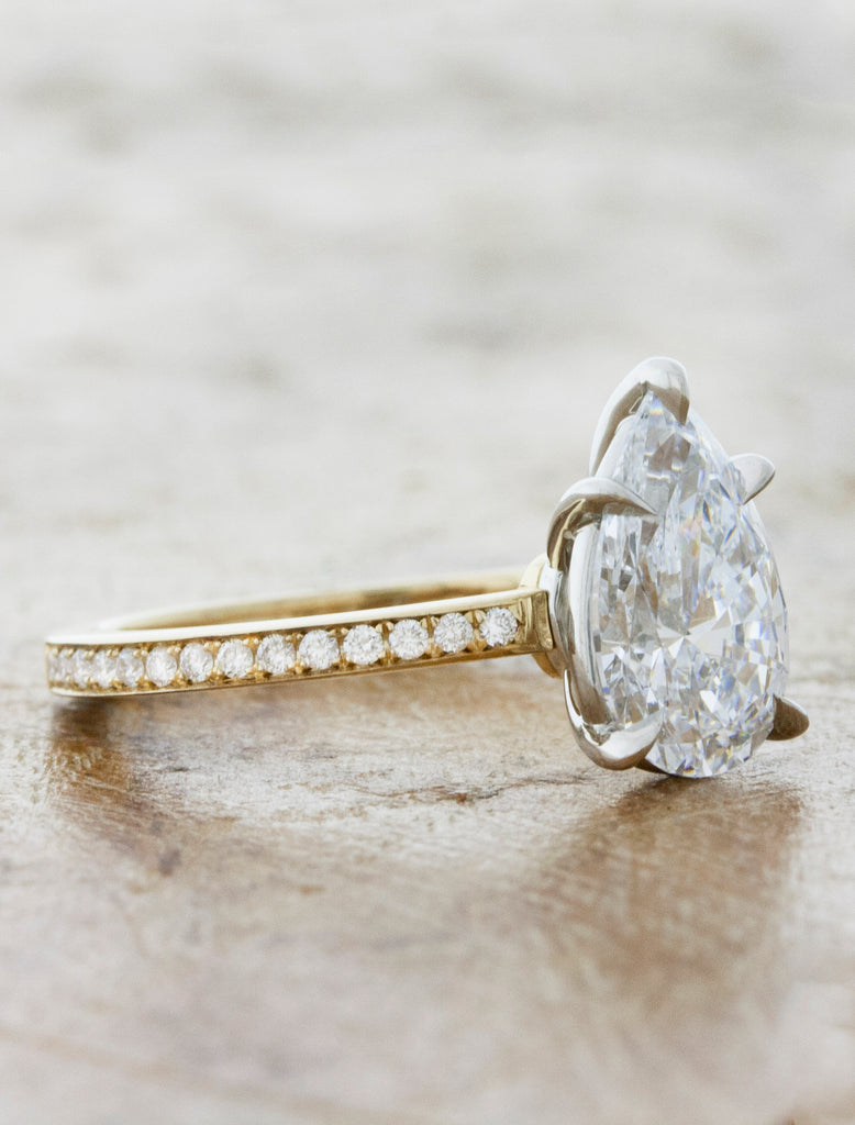 A gorgeous and thin 1.55 mm diamond band makes this ring look delicate, easy and so pretty.  Her mixed platinum and yellow gold setting holds a precious 1.77ct E VVS1 pear cut lab grown diamond.