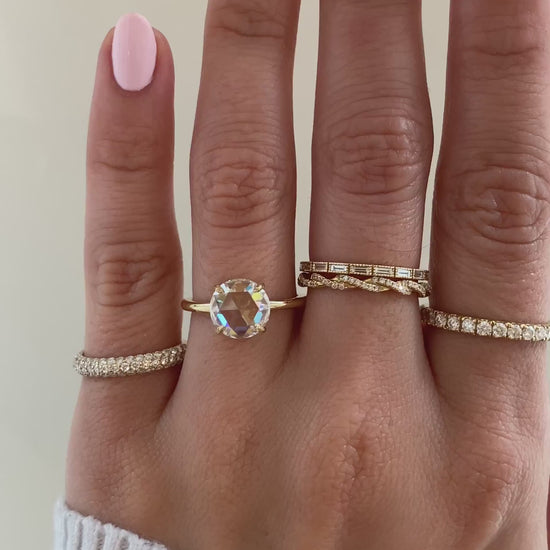 At the heart of the Leona is a mesmerizing rose cut moissanite hugged by four leaf engraved prongs. This unique stone infuses the classic solitaire style with a fresh and modern perspective, making it an ideal choice for those who appreciate simplicity with a touch of contemporary sophistication. Set with an 9mm rose cut moissanite in your choice of recycled metal.