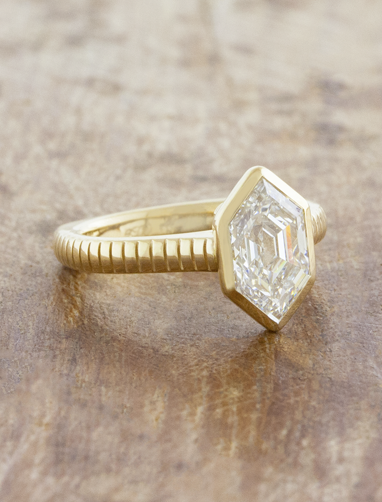 Lira features a striking step-cut Dutch Marquise diamond, bezel set to enhance its geometric brilliance. A vertically grooved band adds bold texture and modern elegance to this distinctive design.