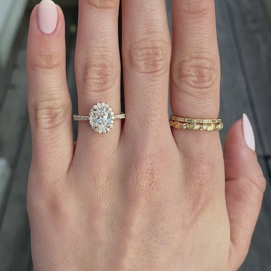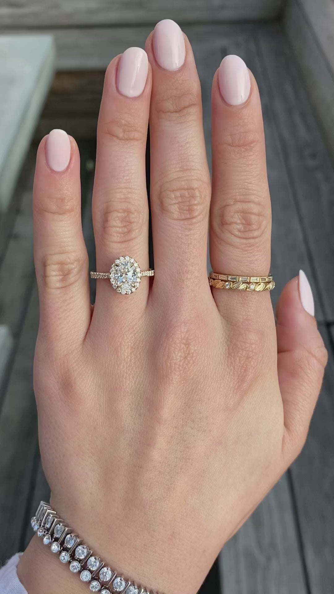 Lor exudes timeless elegance with a romantic twist. At her heart lies a dazzling oval cut diamond framed by a dazzling halo sitting atop a diamond adorned band. The delicate floral basket underneath provides a sweet, romantic surprise—a symbol of love blossoming beautifully.