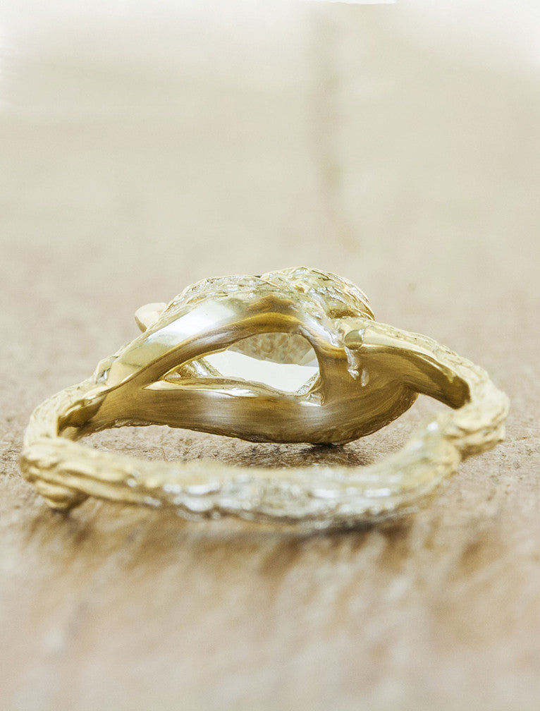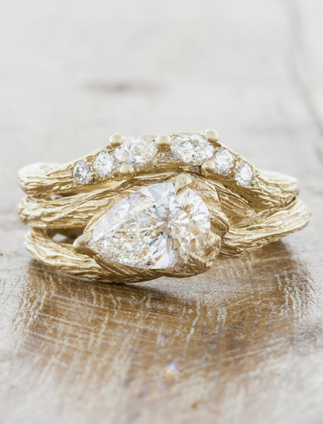 The Luu combines the art of sculpture with a beautiful pear shaped diamond we sourced for our client who sought something unique, designed and elegant.  On this piece, we hand-carved a design that mimics the bark texture of a beautiful, Sequoia tree - inspired by a trip to the magnificent Sequoia National Park in California.   Handmade in NYC.