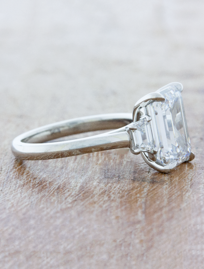 Maria is classic, refined, and regal.  Her emerald cut center stone takes center stage accompanied by two equally beautiful trapezoid lab grown diamond accents. Also available with natural diamonds.