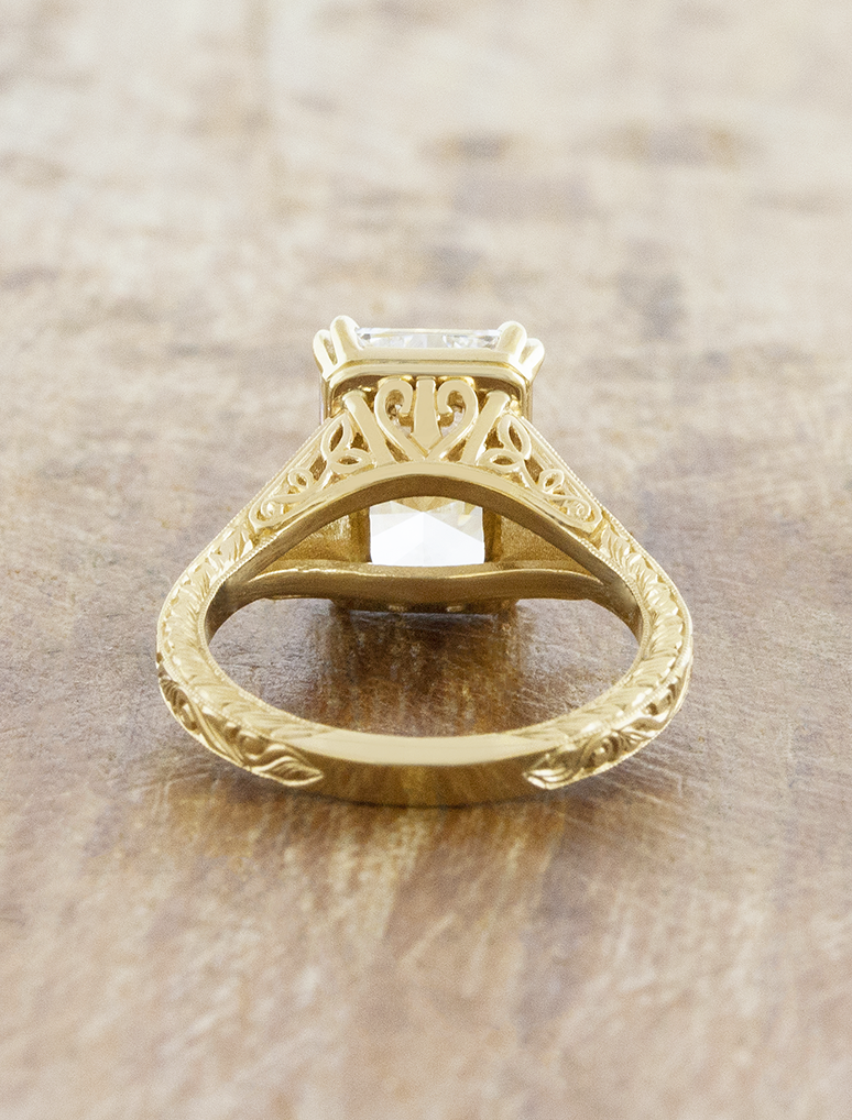 Mariposa stuns with a regal presence, featuring a tapered band lined with two rows of pavé diamonds and detailed with hand-engraving and delicate filigree. Double claw prongs embrace a radiant cut center stone, creating an heirloom feel with modern brilliance.