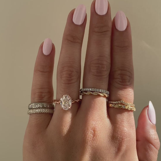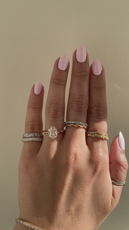 Marjorie features a stunning oval center stone, delicately framed by a peek-a-boo halo of shimmering diamonds. Her band, crafted in a twisted rope style, symbolizes the intertwining of two lives into one.