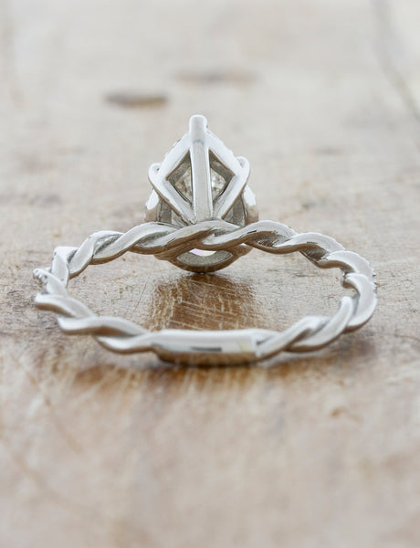 Matilda is a poetic expression of love, with a graceful pear diamond cradled by a four leaf engraved prong and a peek-a-boo halo that shimmers like a secret promise. Its twisted rope band, twinkling with diamonds, entwines romance and elegance in every curve.