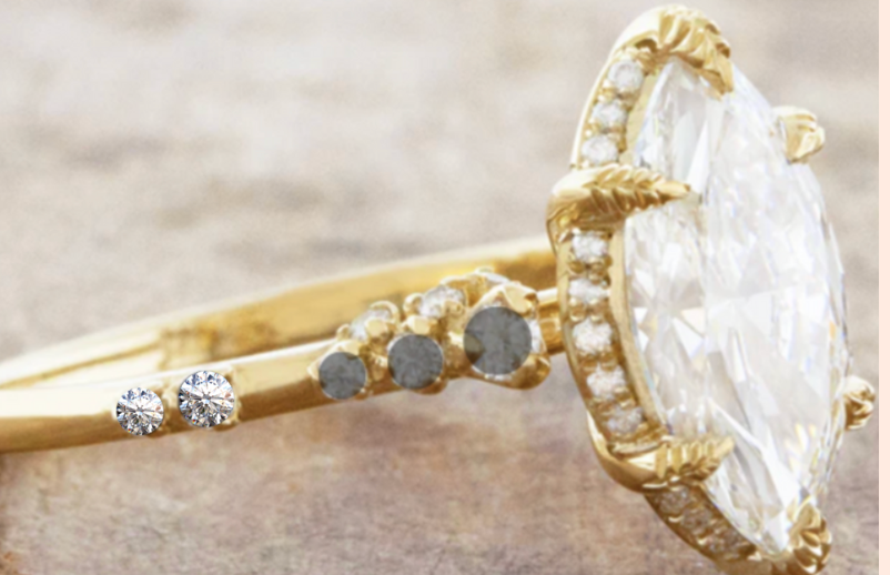 • Design with salt & pepper diamonds along the band. Mix in colorless diamonds, adding more colorless as you move further away from the center stone (should be all colorless at the furthest point)