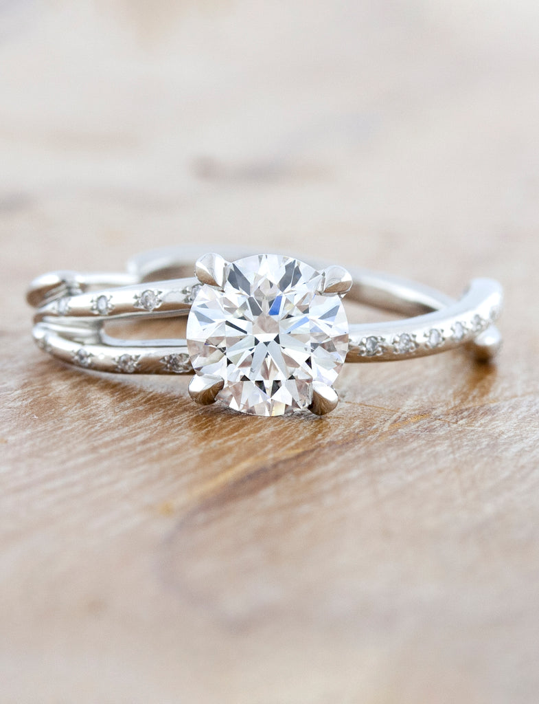 The Melinda combines sculpture and symbolism. She features a split shank, symbolizing the merging of two paths into one destiny. It's diamond accented wave-like band elegantly contours the finger with a  4-prong setting.  Pairs beautifully with the Selene wedding band.