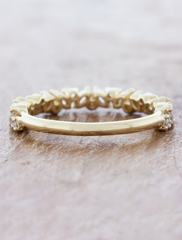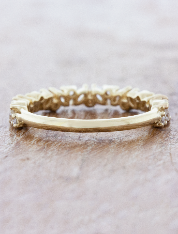 Meredith is an elegant collection of round and marquise cut diamonds that form into a beautiful wedding band. The stones are set in an alternating pattern halfway around the band for a blingy, vintage look.