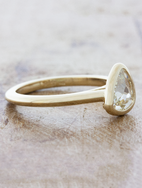 Mettie steals your heart at first glance.  She cradles a free form shaped 0.75ct maccle rough diamond which is nesting in a sleek looking 14k yellow gold bezel solitaire.
