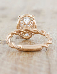 Mirabelle is made in a gorgeous precious recycled metal in your choice of rose, yellow or white with a twisting band that is sprinkled gloriously with brilliant white diamonds.  Inspired by our Matilda design, this ring features even more sparkle, with diamonds that climb all the way up through the prongs of the basket.  We sourced a brilliant oval diamond for her heart and surrounded her with a wave like peek-a-boo halo.