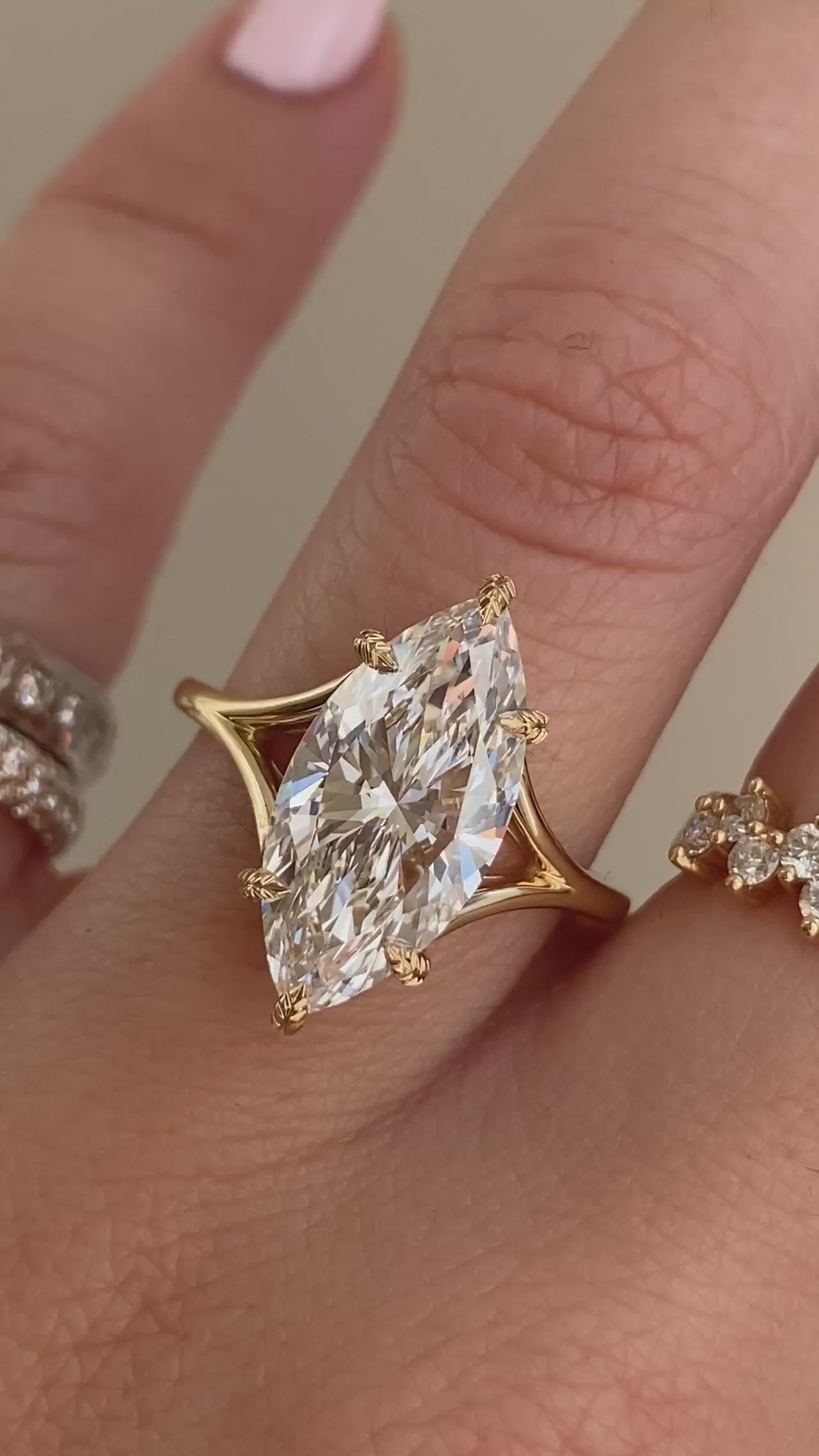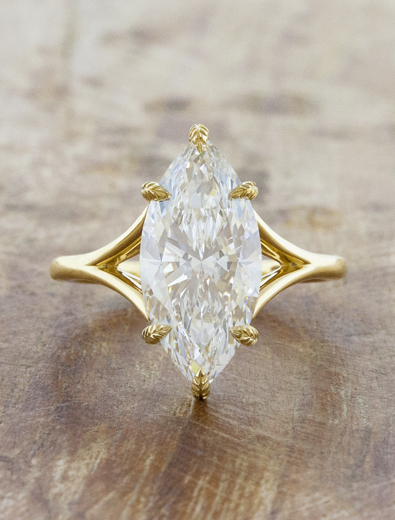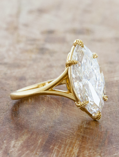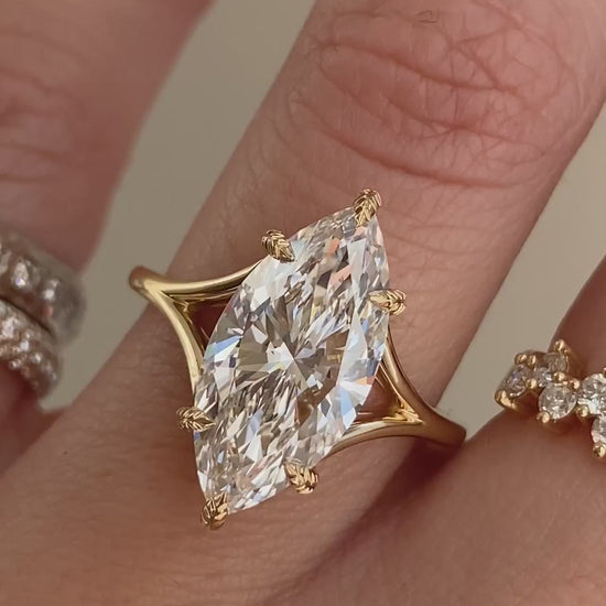 Mylex is elegance and sophistication wrapped into one, set with an exquisite marquise cut diamond. Sleek and simplistic, her split-shank band mimics a hug, representing love and comfort with 6 leafy prongs to add a subtle organic pop.