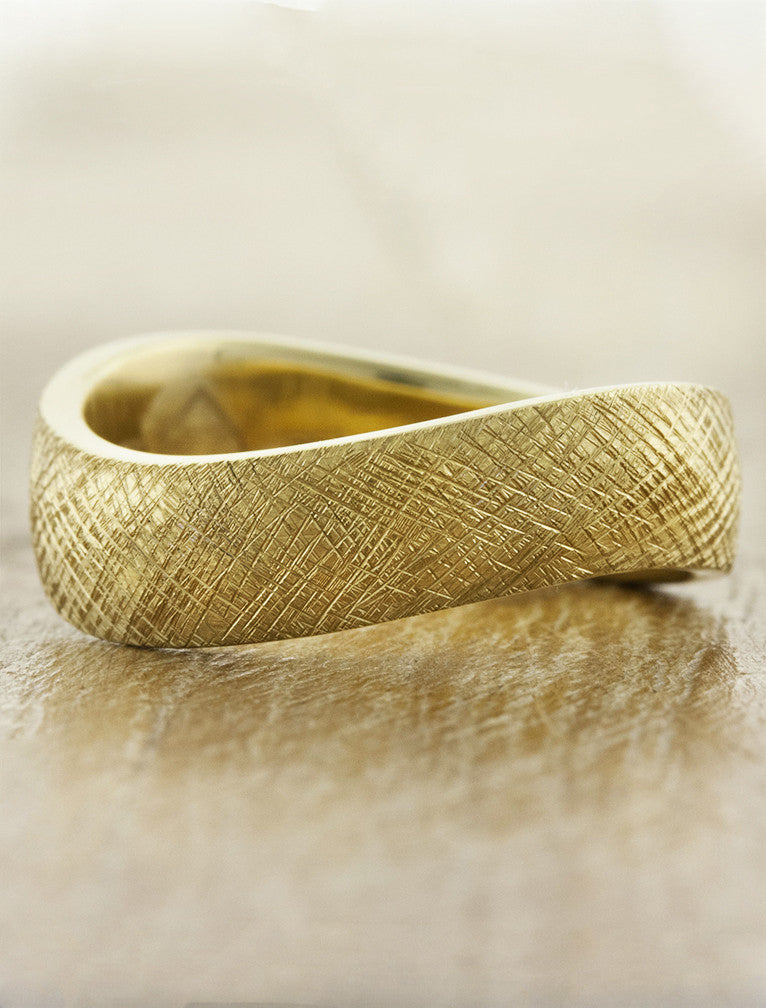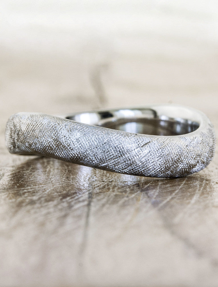 The Nico men's wedding band combines sculpture in his unique curved shape, and hand-engraved florentine texture to create the perfect masculine wedding band.