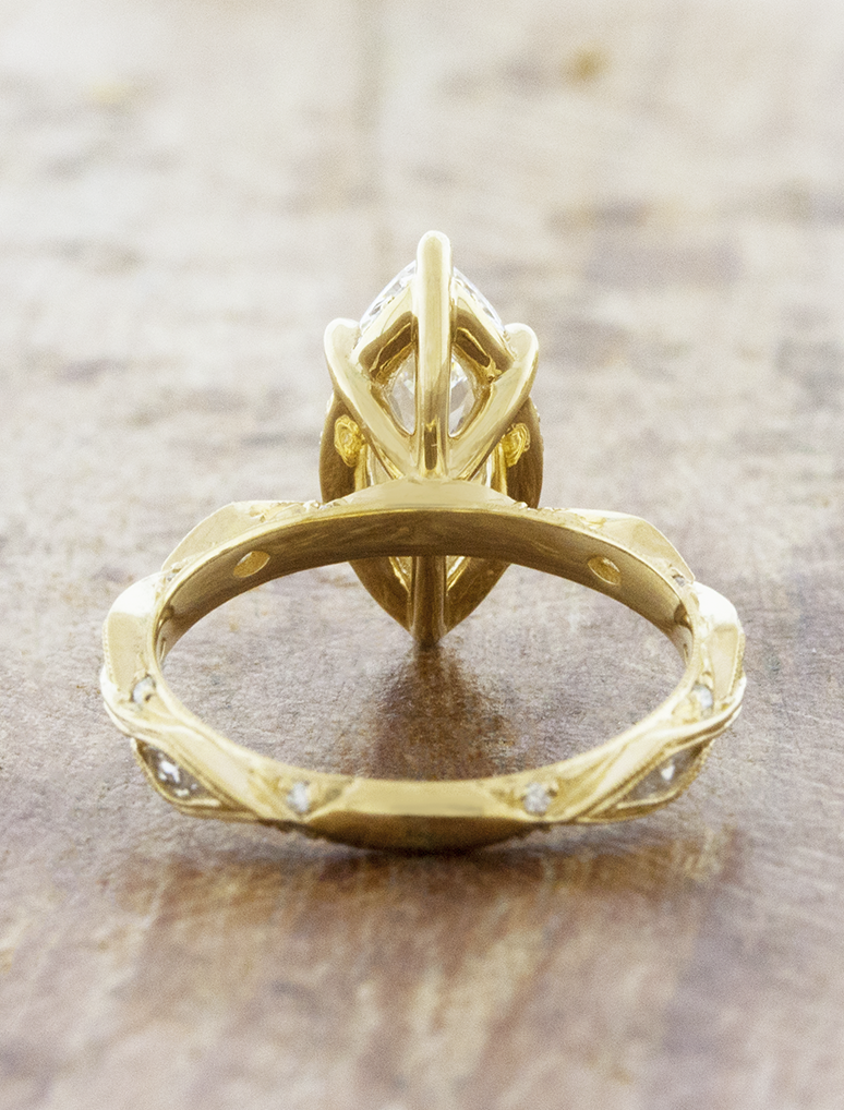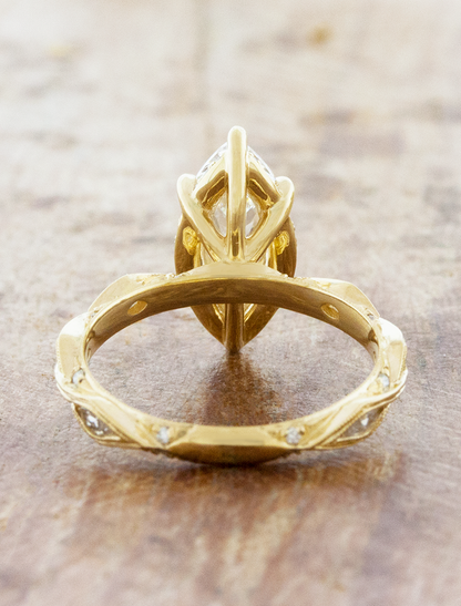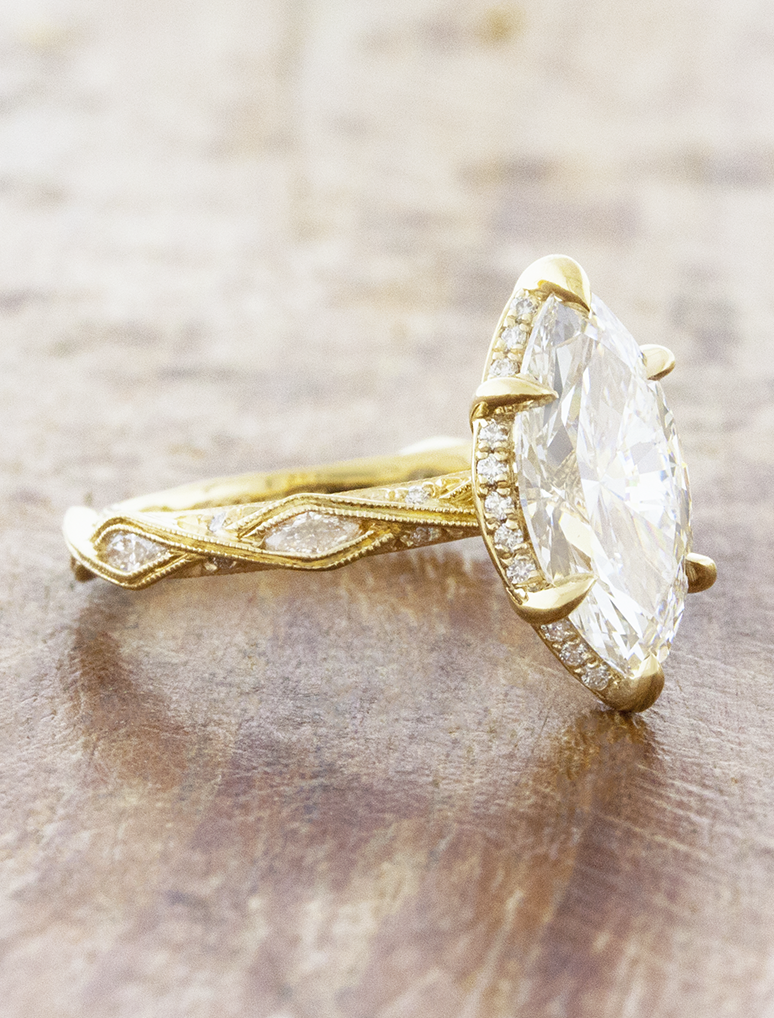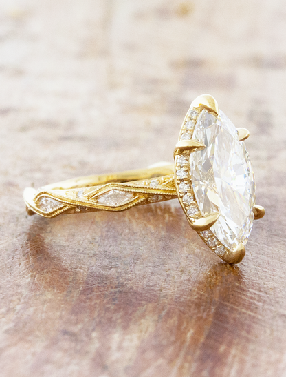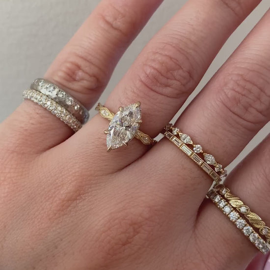 Odaé showcases an intricate vintage inspired design that runs all the way around the band with white diamonds set within the features of the band. A beautiful marquise sits at her heart elegantly framed by a peek-a-boo halo of diamonds.