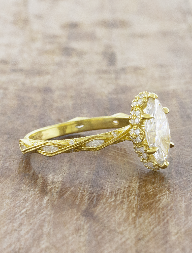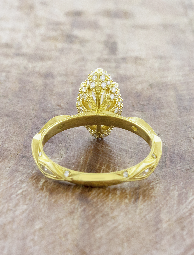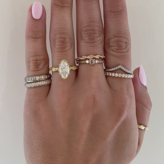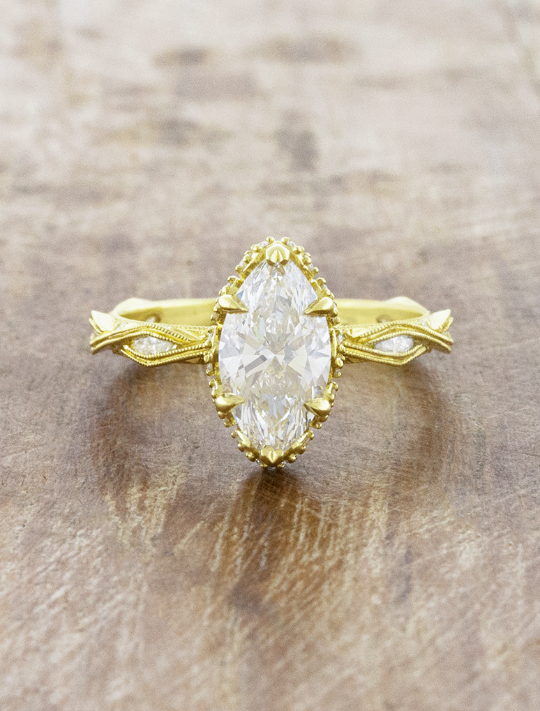 Odette showcases an intricate vintage inspired design that runs all the way around her 18k yellow gold band with white diamonds set within the features of the band. At her heart lies a gorgeous 1.50ct D color VS1 clarity lab grown marquise diamond.