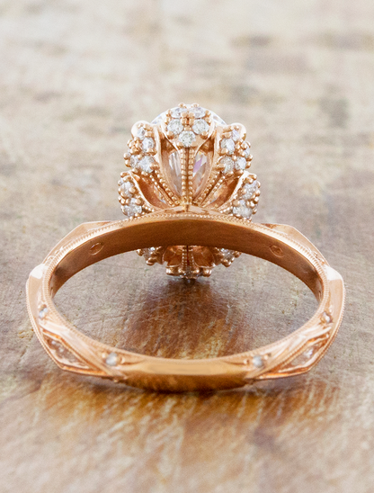 Inspired by our Odessi, just scaled down in width, the Odette showcases an intricate vintage inspired design that runs all the way around a her band with white diamonds set within the features of the band. This desired design is the perfect combination of vintage chic and glamour.