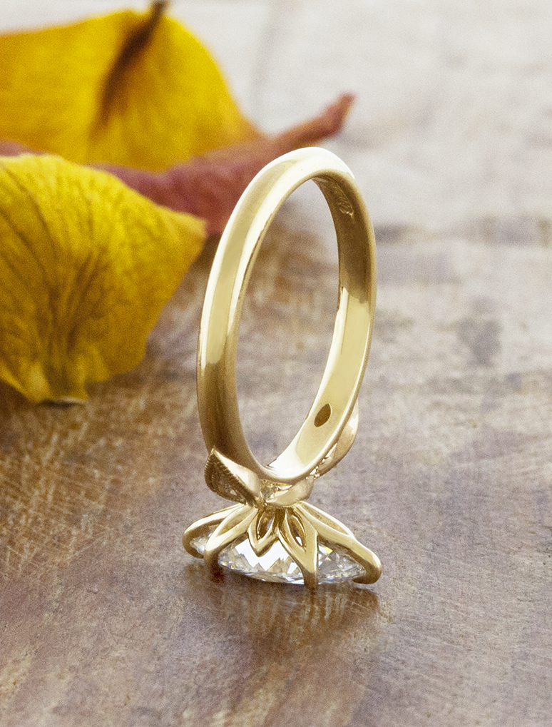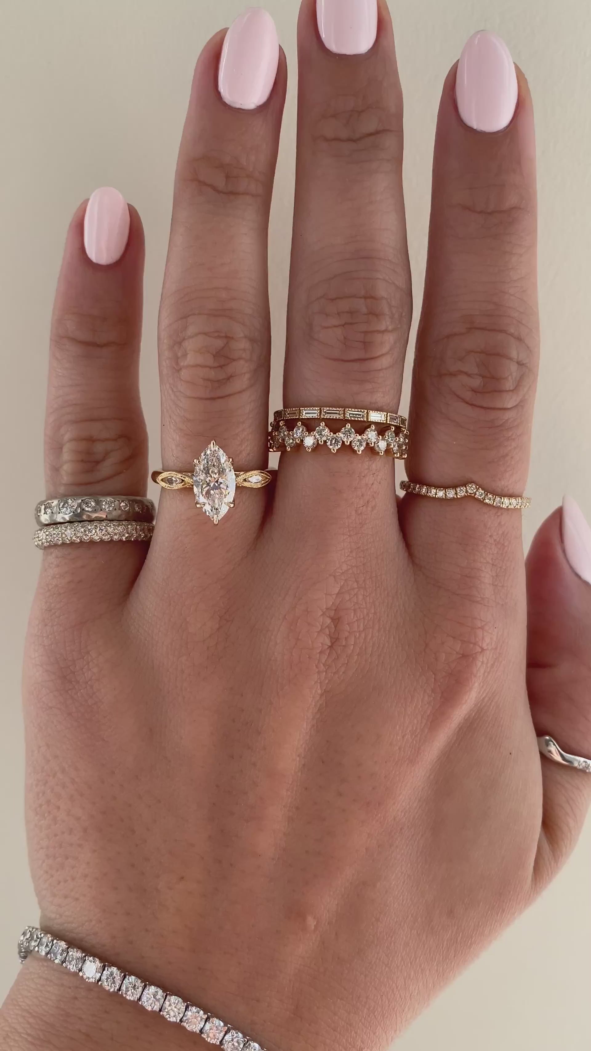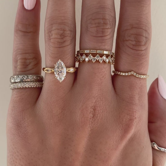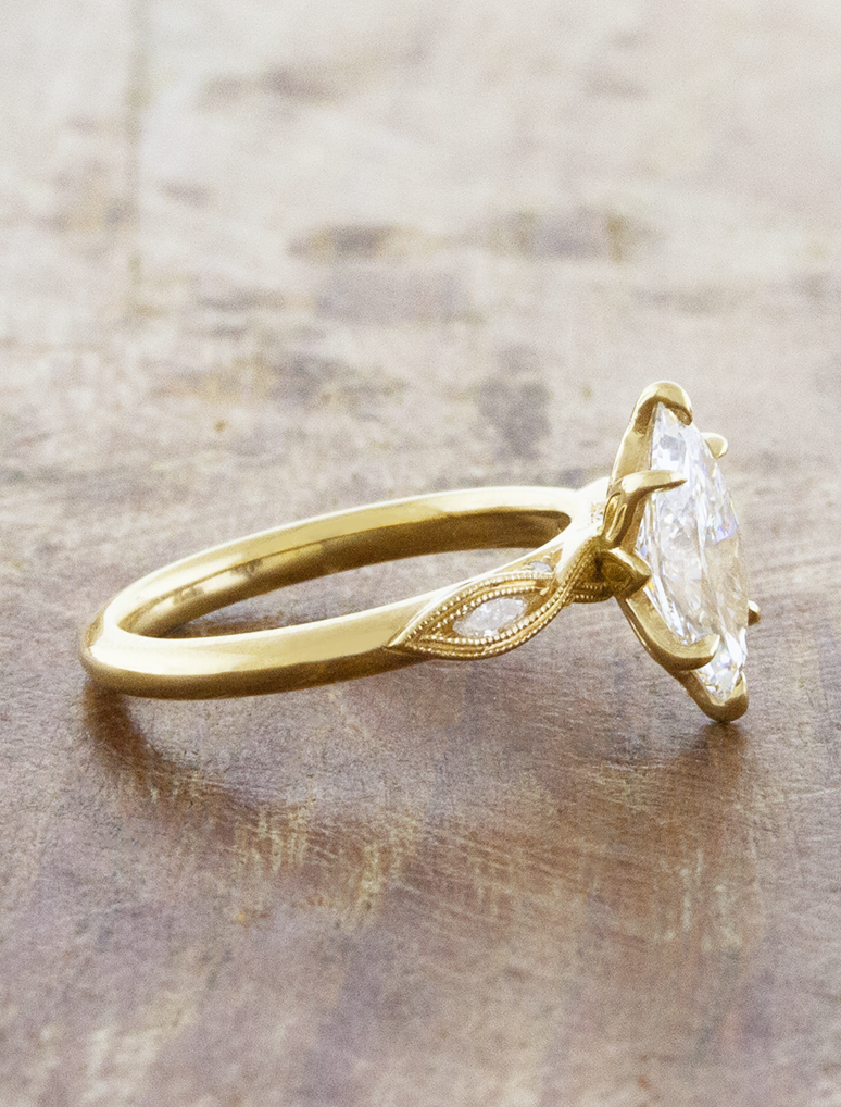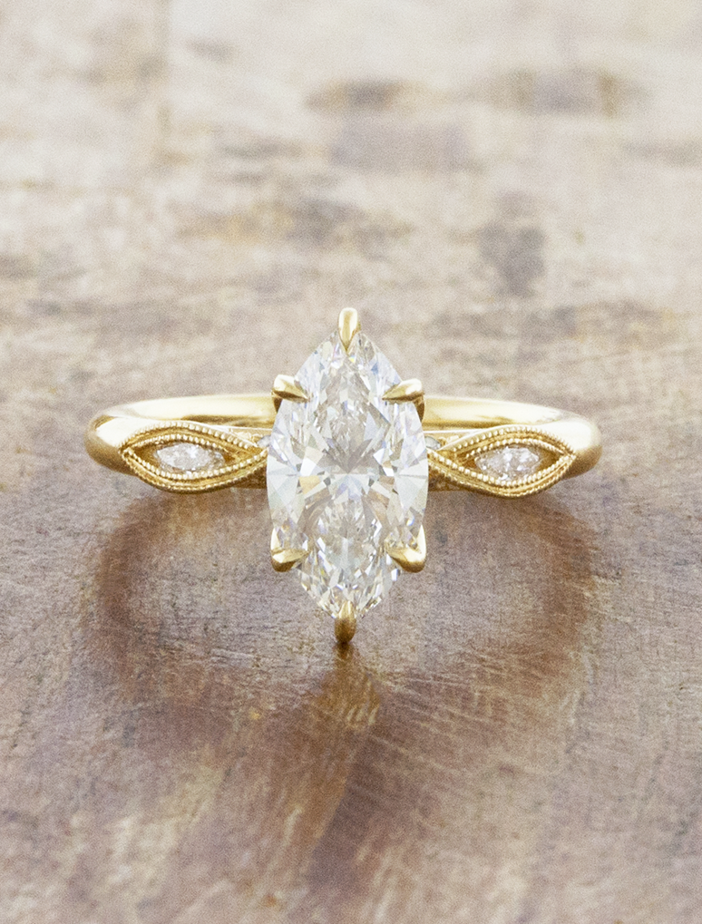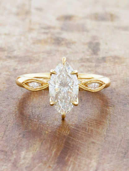 Odika showcases an intricate vintage inspired marquise design that sits on either side of her center stone - a petite three-stone take on our beloved Ode style. Her marquise heart is set within a blossoming tulip basket and secure with 6-claw prongs.