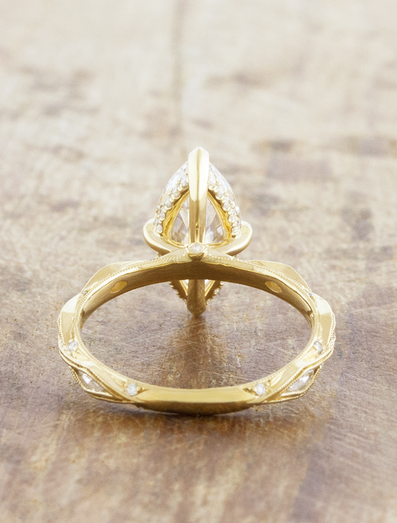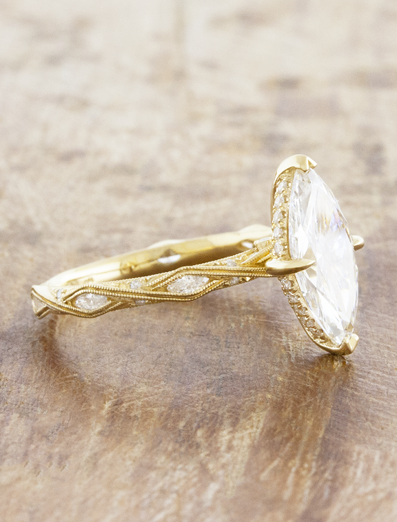 Odira showcases an intricate vintage inspired design that runs all the way around her 14k yellow gold band with white diamonds set within the features of the band. At her heart lies a gorgeous 2.08ct E VS1 lab grown marquise diamond framed by a hidden halo and compass set prongs.