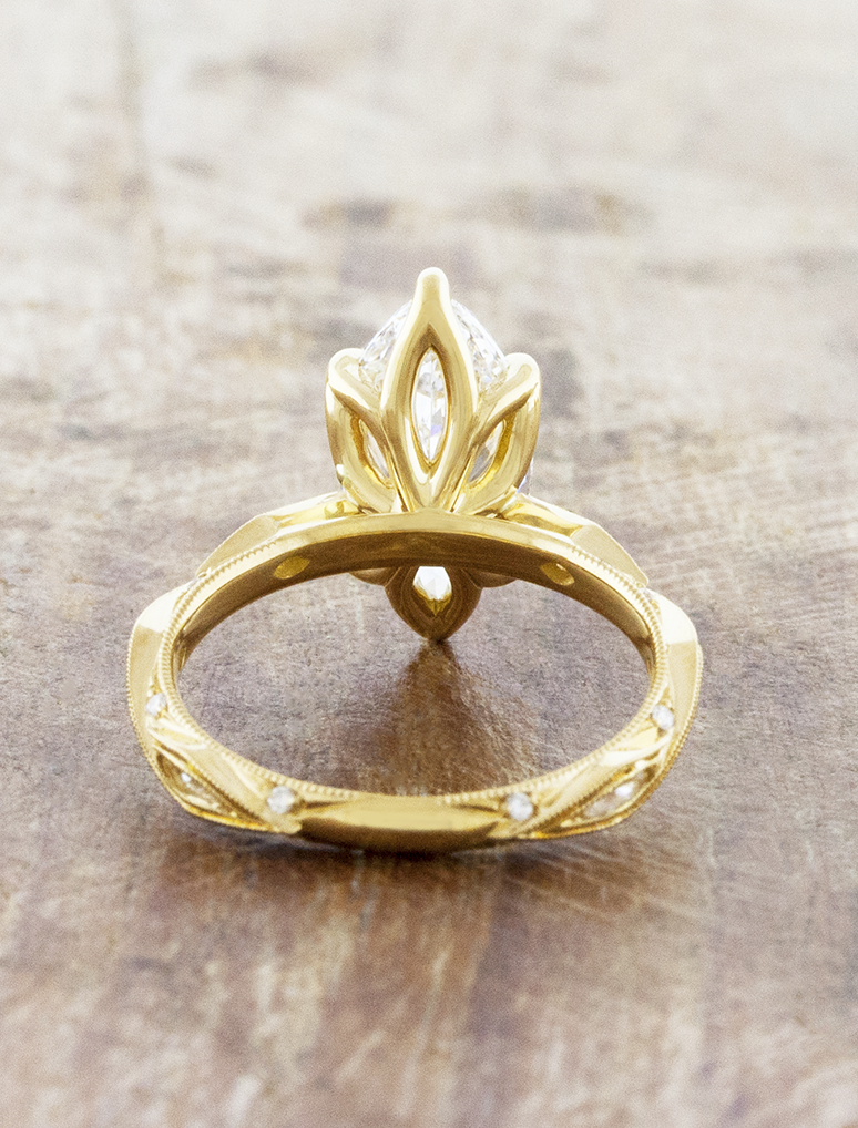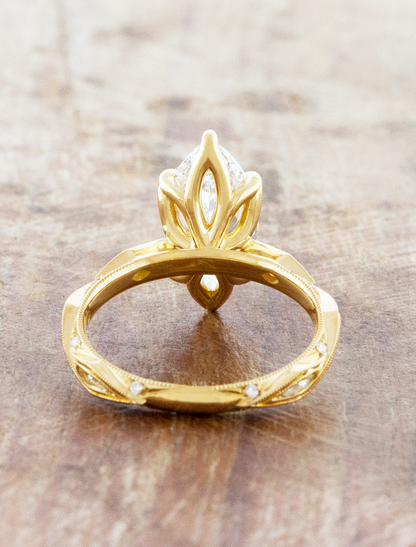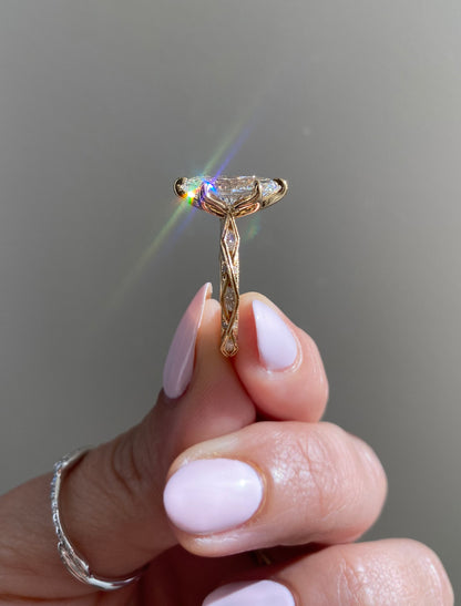 Odolina showcases an intricate vintage inspired design that runs all the way around the cathedral style band with white diamonds set within the features of the band. A beautiful marquise sits at her heart with a blossoming tulip basket decoratively securing the center stone.