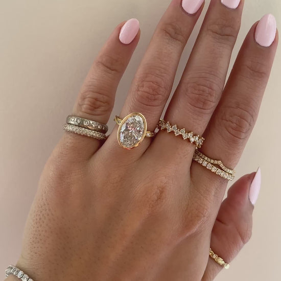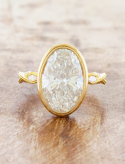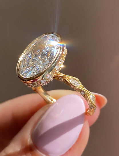 Odyne is a regal, vintage-inspired engagement ring that exudes timeless elegance. An oval diamond center is embraced by a milgrain detailed bezel, resting in a crownlike basket that evokes royal splendor. Delicate milgrain and diamond accents along the band complete this ornate design, marrying old-world charm with graceful sophistication.
