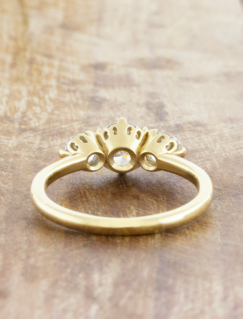 Ohara flaunts a romantic trio of round brilliant diamonds, each resting in an ornate  vintage inspired basket. At her heart, a 1.02ct D VVS2 lab grown round cut secured by six prongs. A classic silhouette and delicate detailing adds timeless charm and heirloom appeal to this 14k yellow gold beauty.