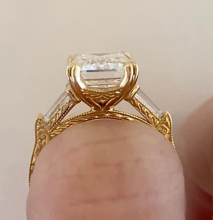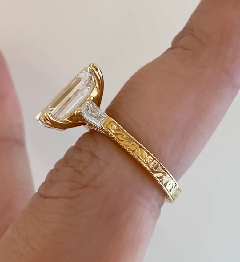 Design Details: Design with Maria's side stones. Incorporate engraved details on all 3 sides of the band, as well as the gallery (pictured). Single prongs around the center stone.