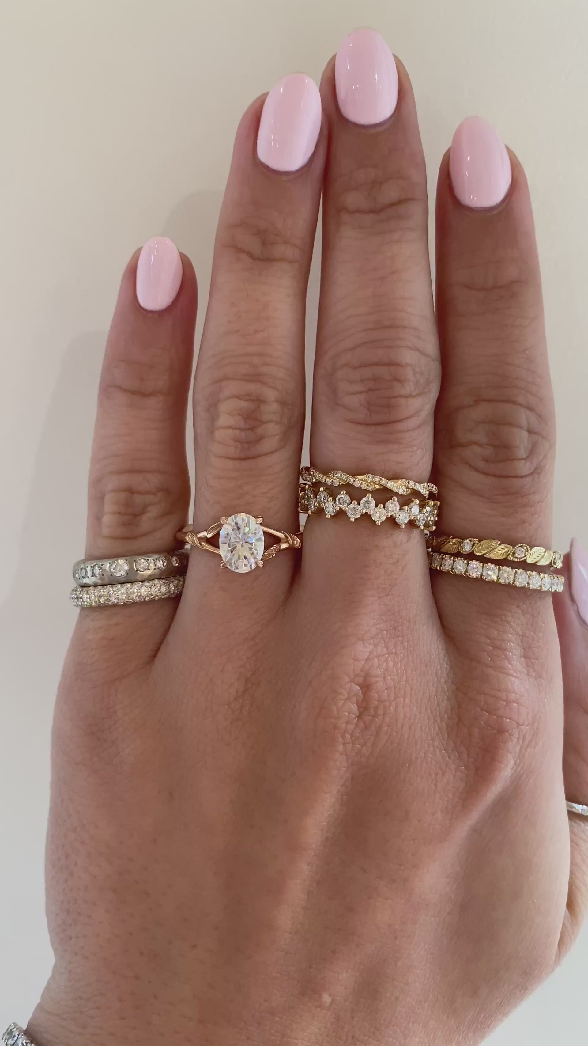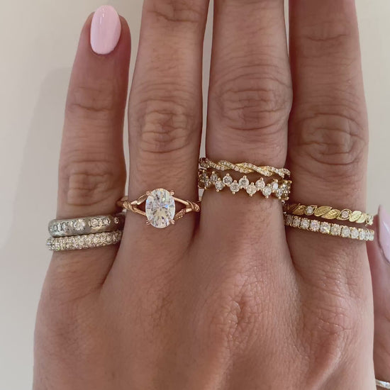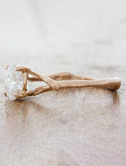 The Pembroke is simply exquisite in all her nature-inspired pizzaz. She is created in 14k rose gold, with an amazing oval cut 1.33 carat moissanite that sits like a queen- set in a classic 4-prong setting, but with a leafy twist. To adorn the center stone, you will see four hand engraved leaves that softly cradle the heart of this ring.