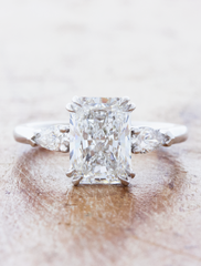 Permelia is something beautiful for the love of your life. She is shown here with an exquisite radiant cut diamond that is the heart of this masterpiece and to its right and left you see unbelievably brilliant lab grown pear shaped diamonds. Also available with natural diamonds.