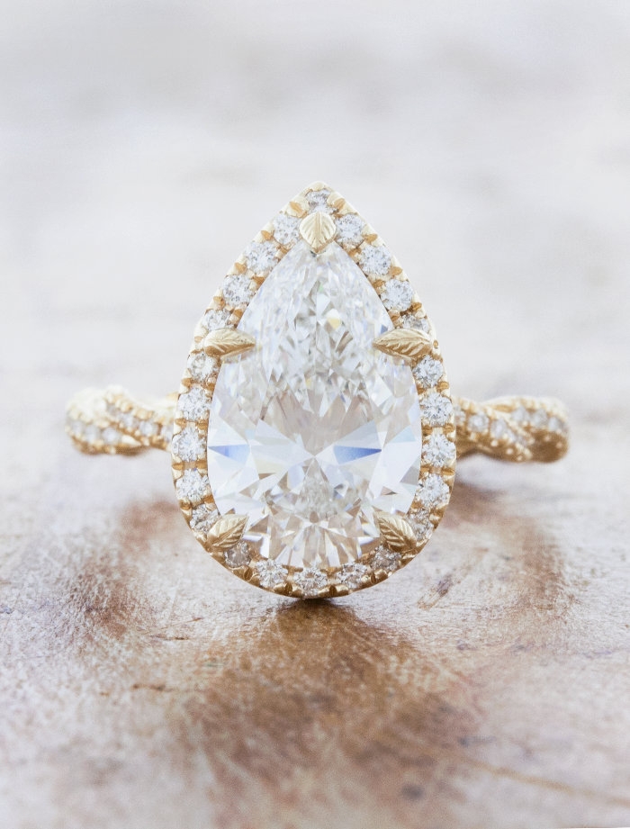 Phoebe- we could go on and on about each and every detail!  She is inspired by our Dory, but with a few extra twists.  Her gorgeous pear diamond is elegantly framed by a diamond halo and held lovingly within a floral-inspired basket with leafy prongs.  On the other side, you will see a pop of color with a sentimental birthstone detail.  Last but not least, the twisted rope band is sprinkled with 0.462tcw of white diamonds and hand engraved bark texture.