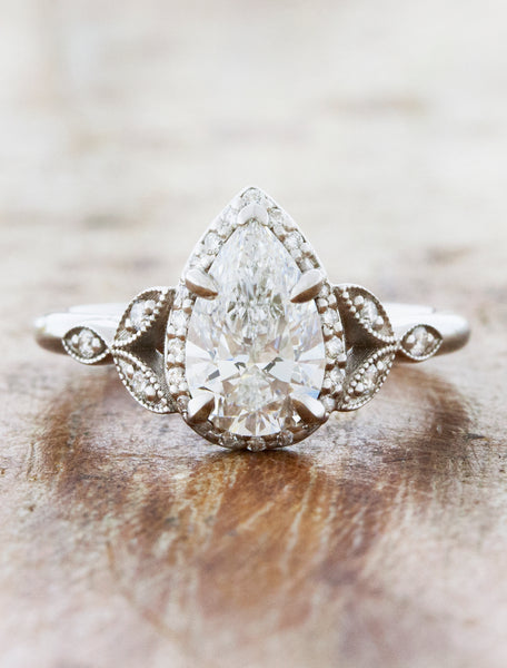 Our Rachael is a vintage dream made in a crisp 14k white gold that makes all the intricate accents pop. She has stunning lab grown 1.04ct D VVS2 pear cut diamond at her center that we know will make your partner's heart melt.