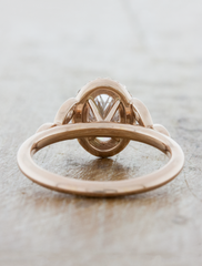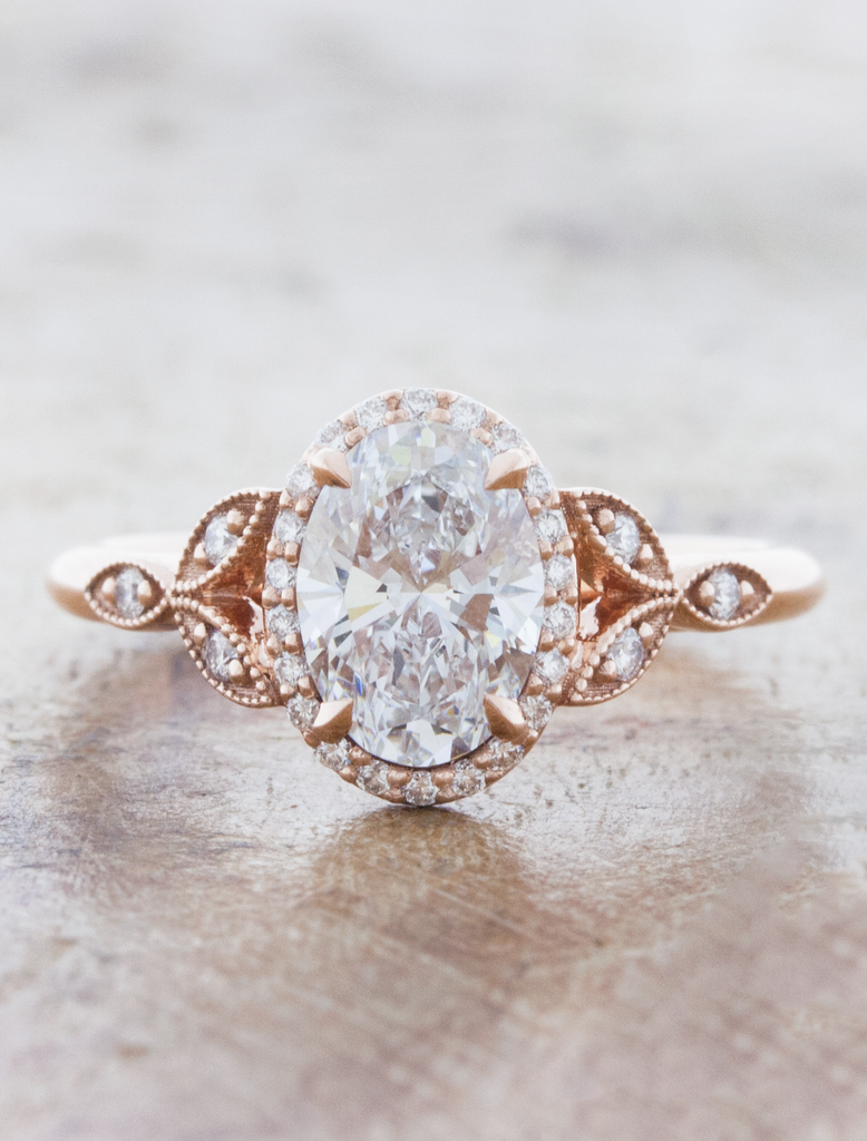 Our Rachael is 14k rose gold elegance and mystic wrapped into one.  She has a IGI certified lab grown 1.10ct E color VVS2 clarity oval cut diamond at her center that we know will make your partner's heart melt.