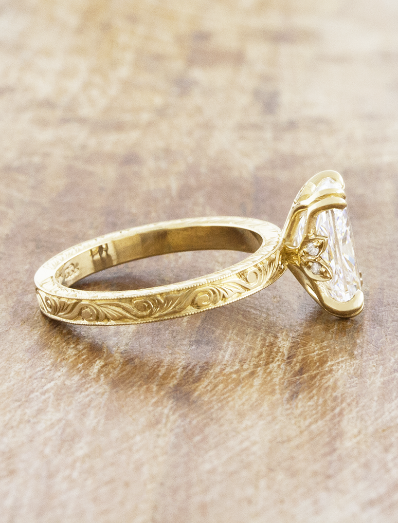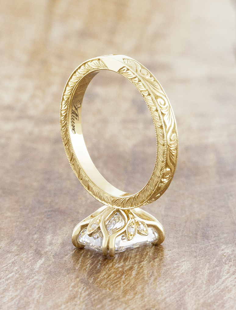 Rhea is a vintage-inspired engagement ring defined by graceful floral elegance with intricate hand engraving that flows delicately along the band. Hidden inner pavé diamonds on one side adds a refined touch of brilliance, making this design timeless and romantic.