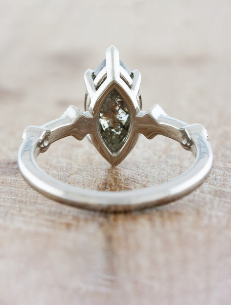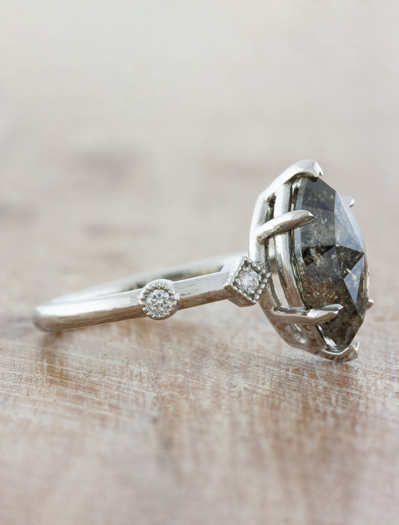 Rowley is a work of love and art.  She holds a rustic, salt and pepper marquise diamond in a vertical position that commands attention.  The marquise is nestled in between white diamond accents that act as her companion much like her future partner will forever and ever.  The play on shapes and textures makes this ring so intriguing.