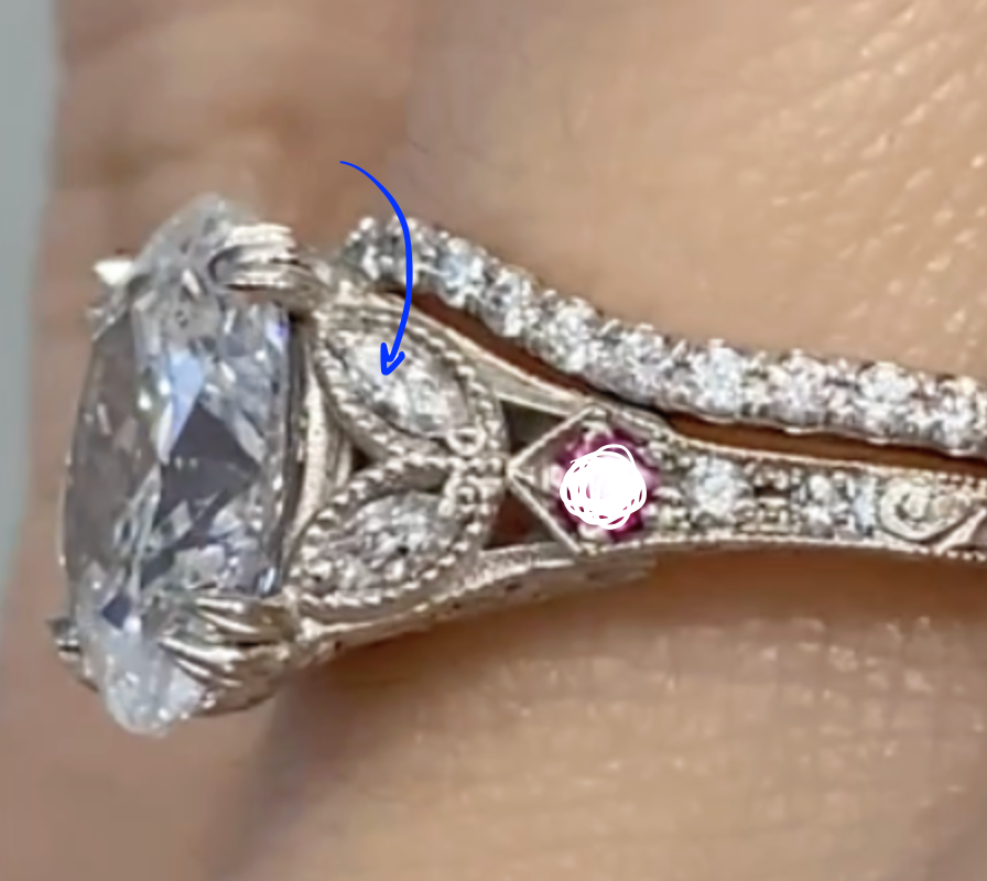 Design Details: Design with milgrain bezel (pictured in 1) and marquise diamond side stones (pictured in 2).