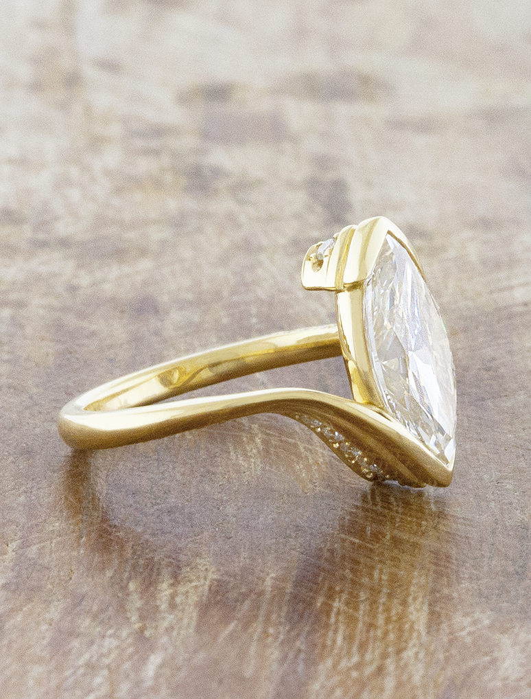 Salena features a captivating bypass bezeled design, where two gracefully curving bands unite in perfect harmony around a marquise cut diamond. Along both sides of her wave-like band is a row of diamonds to add a captivating sparkle to her chic simplicity.