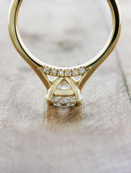 Sansa appears to be your classic round cut solitaire until you see her special surprise of diamonds adorned along the bridge of the band! Her round cut heart is proudly presented atop a cathedral setting.