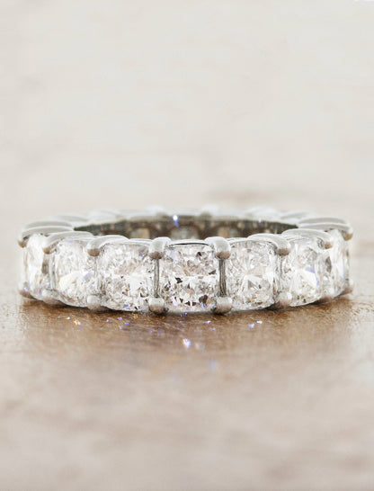 Skye is an eternity band with a sparkle capturing a sophisticated style that radiates from every direction. She beams brilliantly with colorless cushion cut diamonds that run all the way around the band. She is handmade in NYC.