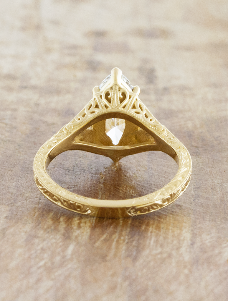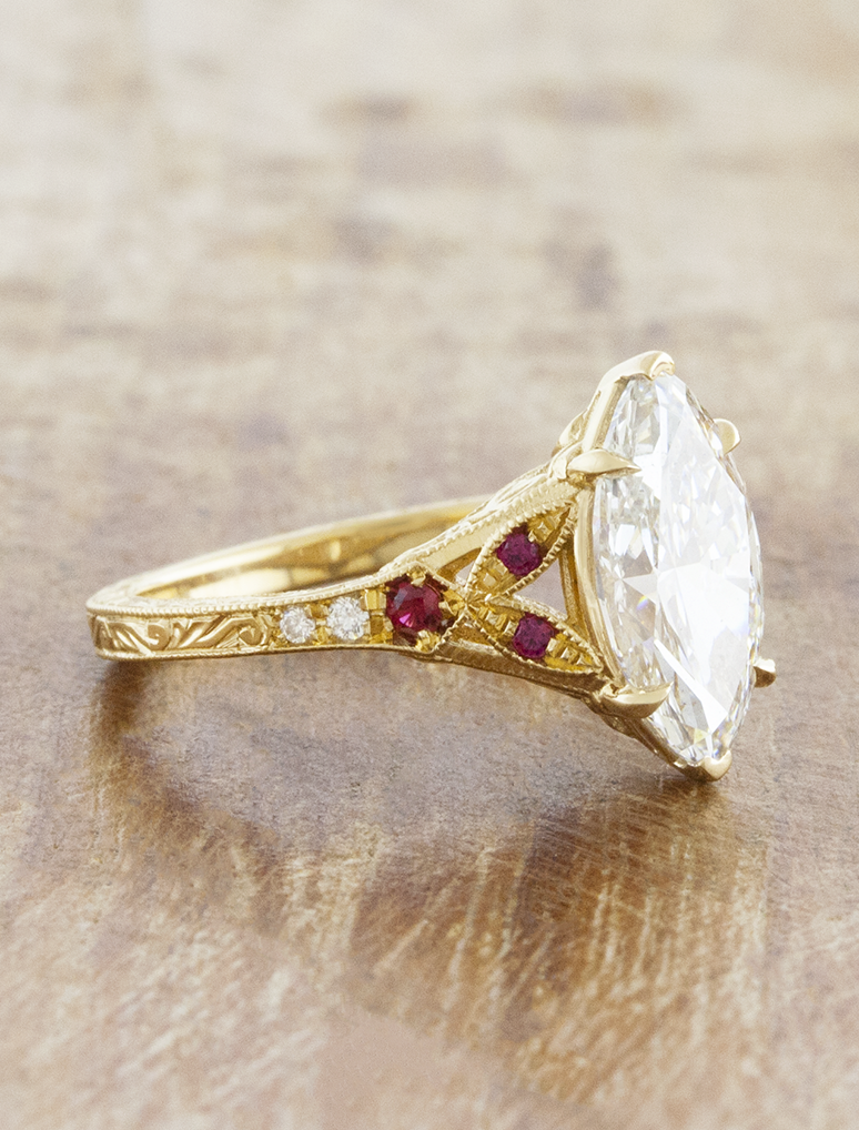 Vintage-inspired engraved engagement ring with ruby accents
