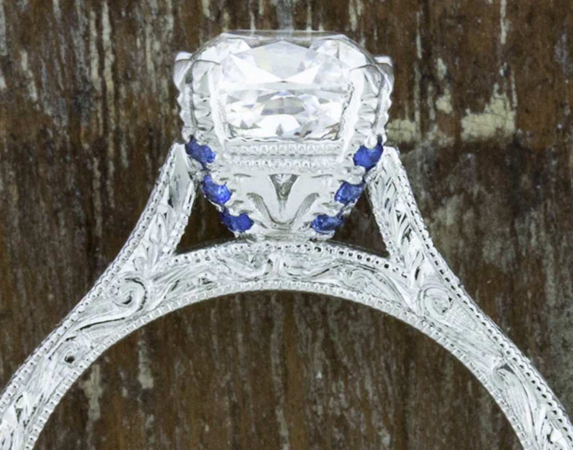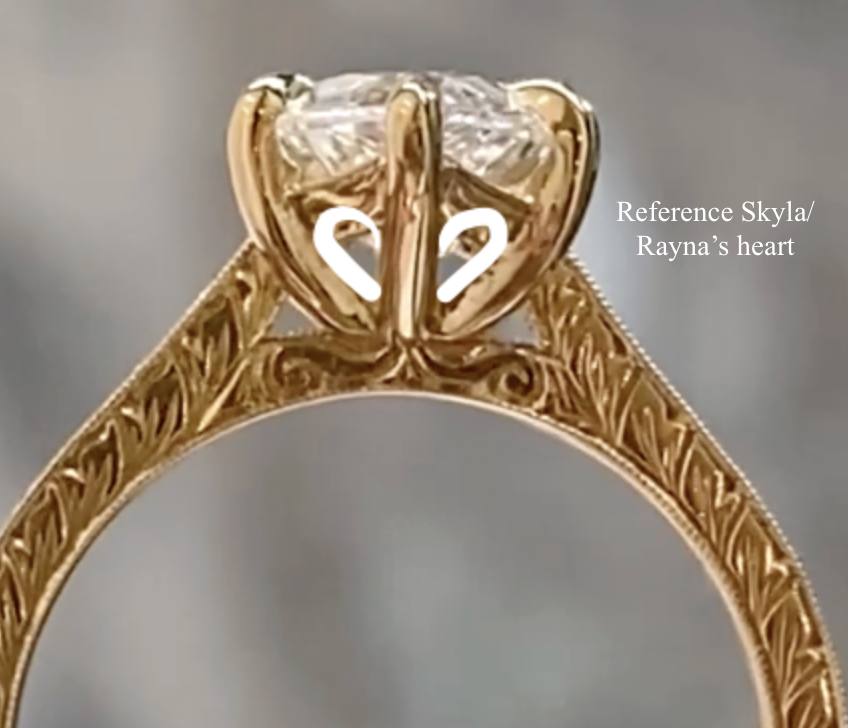 Design Details: Reference first visual for design, incorporate Skyla's engraving on the top & sides of the band. Design to accommodate flush fit w/ future wedding band (no filigree). Reference Rayna's diamond prongs.