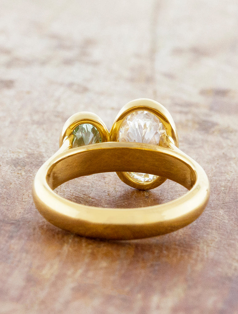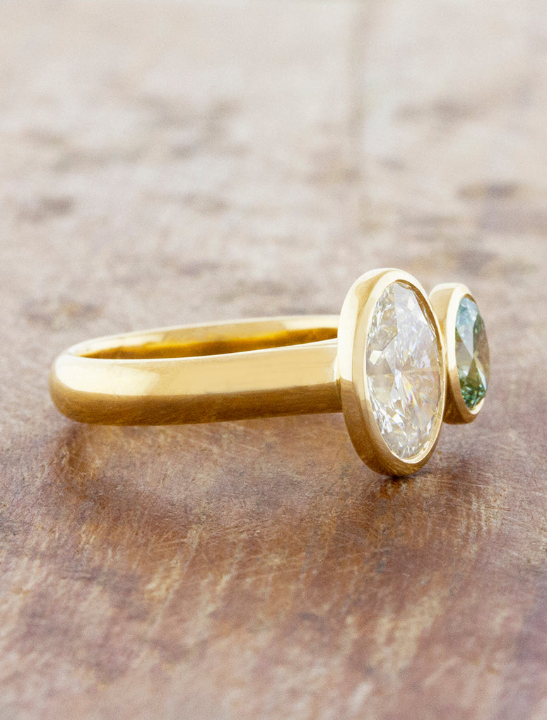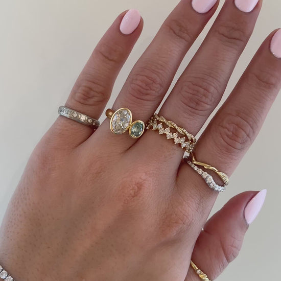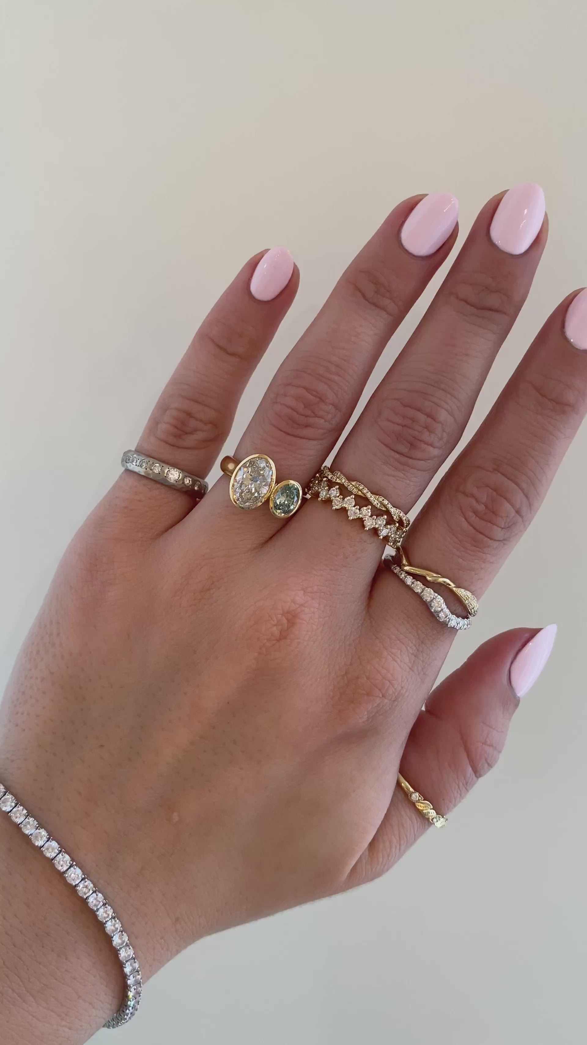Refined and modern, Sorrelle features two oval diamonds, a classic white and a vibrant fancy green, nestled side by side in rich golden bezels atop a bold 3.5mm band. A sleek toi et moi silhouette that symbolizes “you and me forever,” Sorrelle celebrates love in perfect harmony.