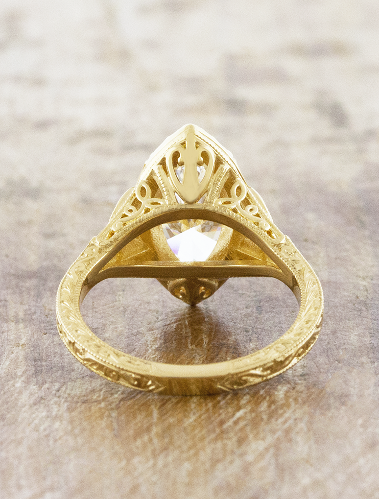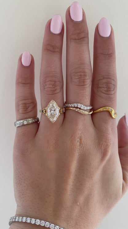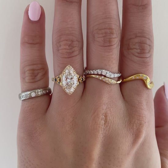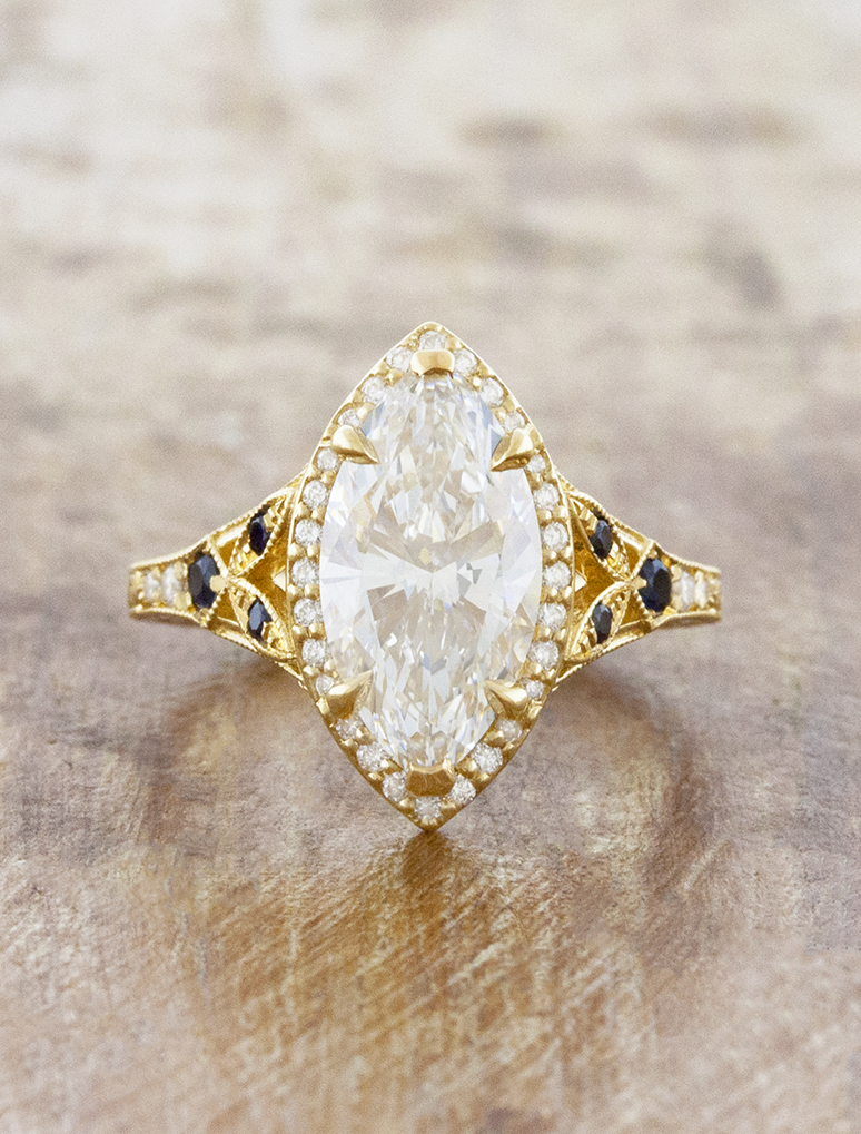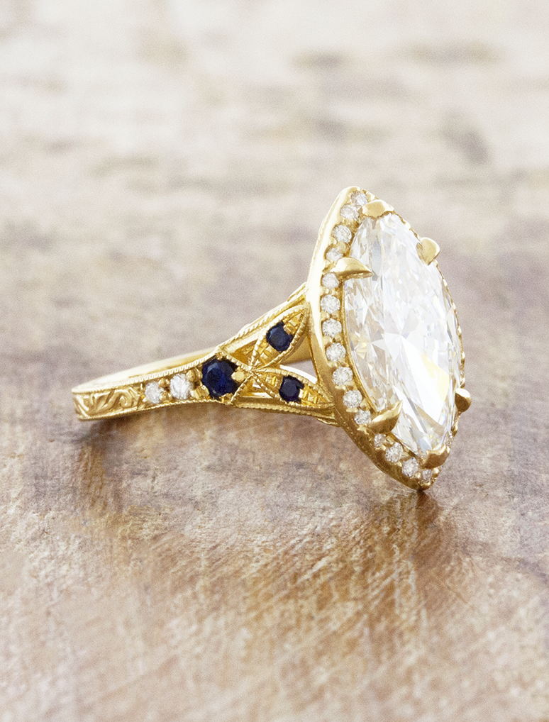 Inspired by our Skyla, our Stella embodies vintage elegance and romance. Her ornate, hand engraved setting flows into a split shank band studded with diamond and blue sapphire accents. The marquise centerpiece is hugged by halo of diamonds and antique metalworking details.
