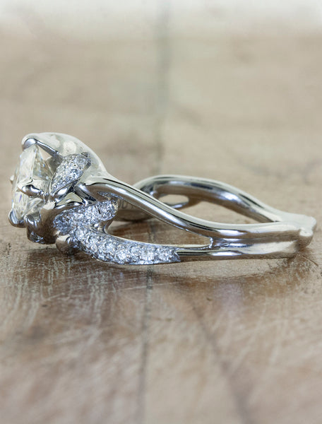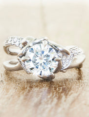 The Sundara is bold and sculptural. This extraordinary piece features our signature split shank, symbolizing the merging of two paths into one. The Sundara has over 30 pave set diamonds throughout the band. Pairs beautifully with the London wedding band.  Set in 14k white gold with a 8mm (2ct) round Charles & Colvard Forever One colorless moissanite.