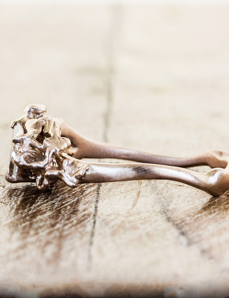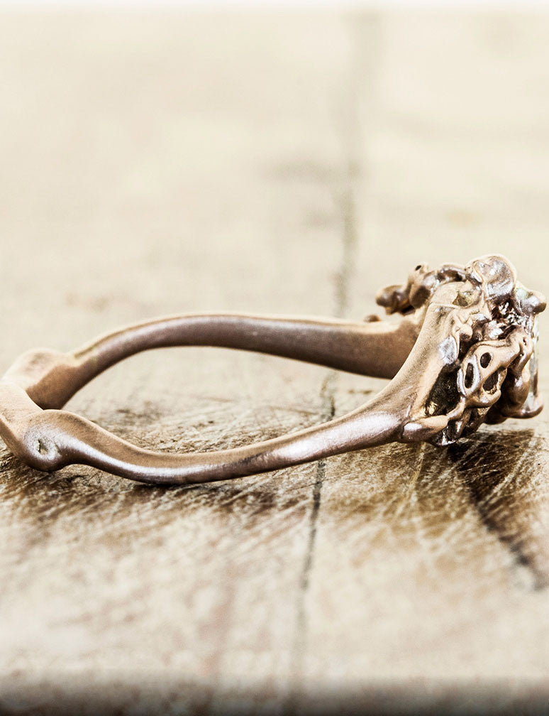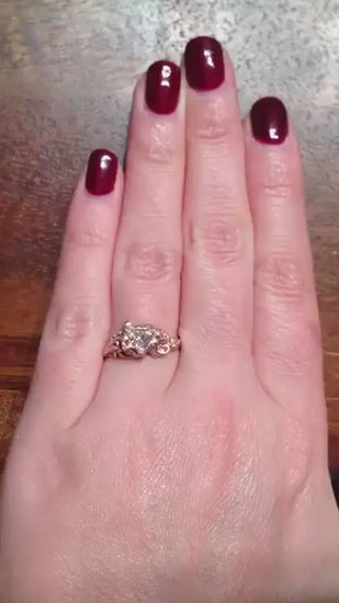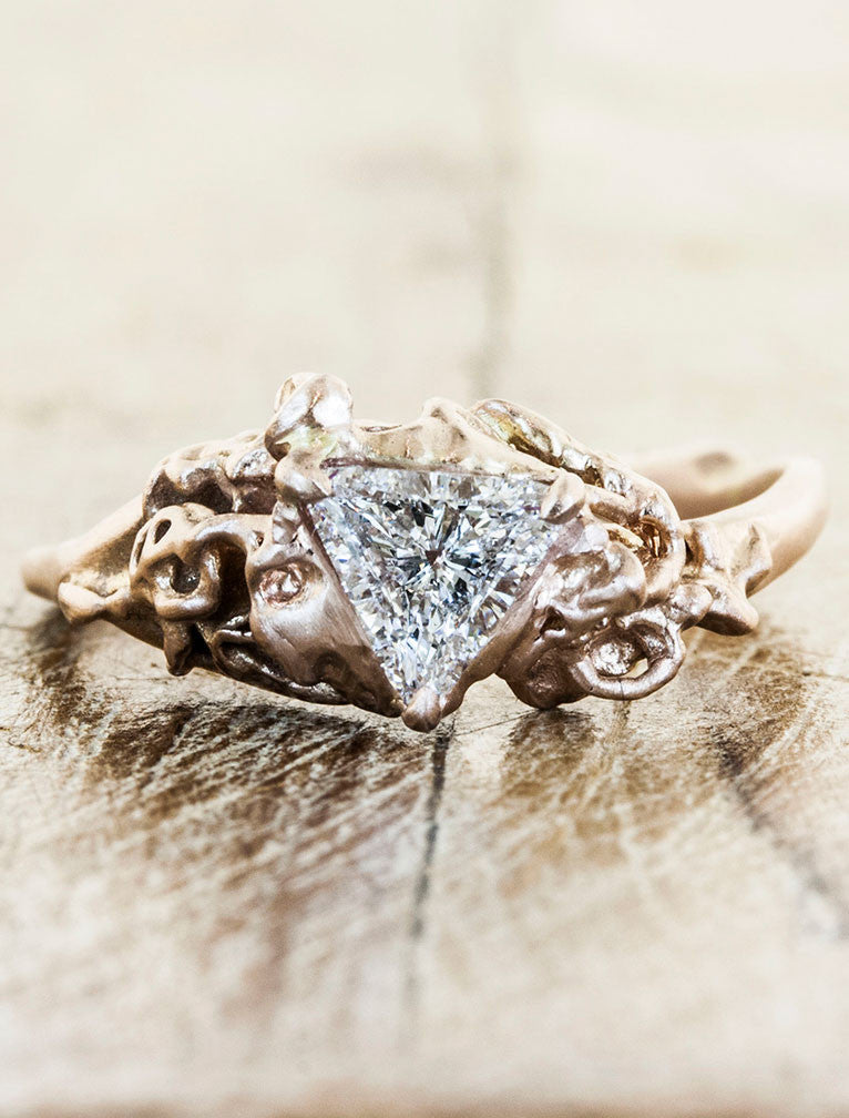 The Suzanna is inspired by the essence of a delicate rose bud, complete with organic flourishes.  Our client asked for a center diamond as unique as her band in rose gold.  We were able to source her a crisp and brilliant trillion 0.48ct diamond.  She will twinkle with this custom design made especially for her.