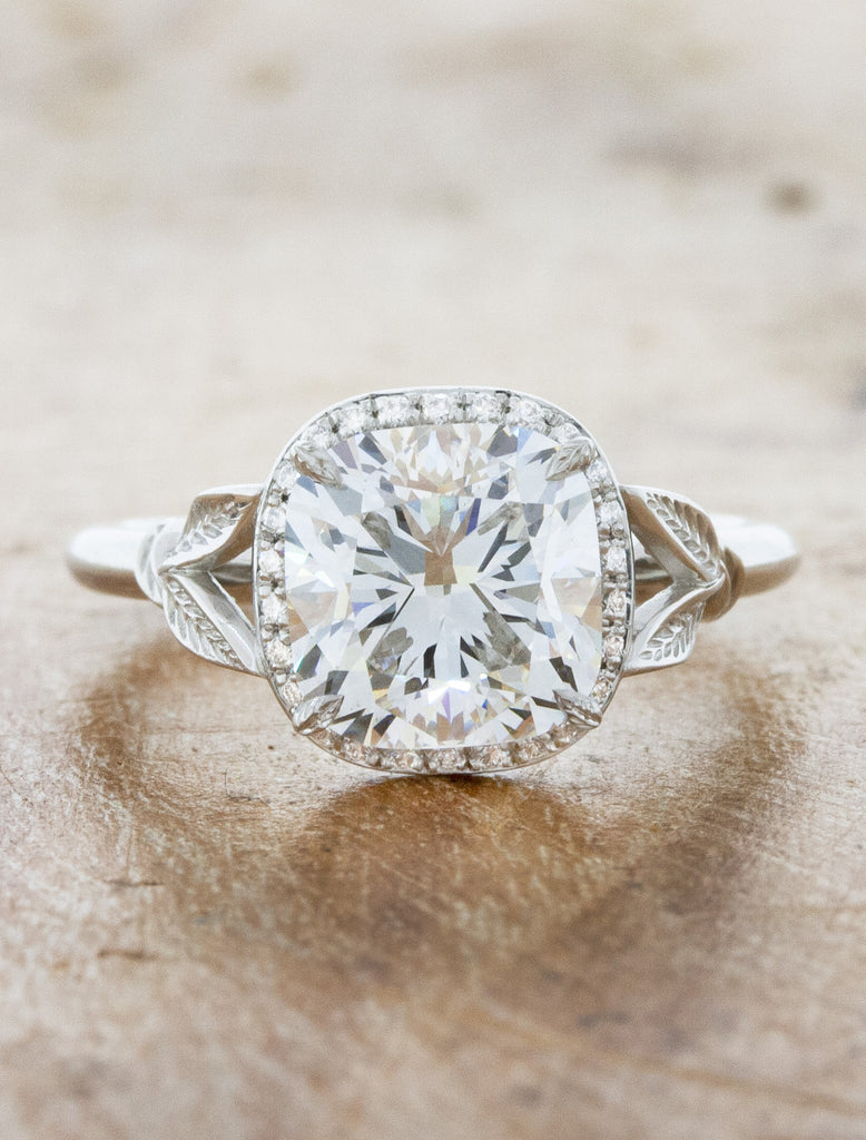 Our Tatiana is elegance and mystique wrapped into one.  Her cushion cut center stone is surrounded by a dazzling peek-a-book halo with leaf details along the band that provide the nature inspiration we all appreciate.