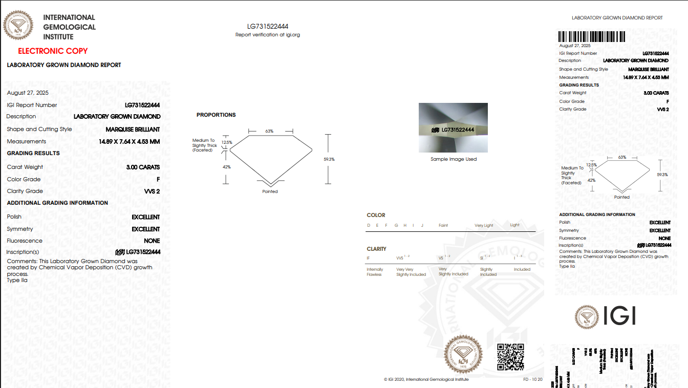 Weight/Size: 3.00 carats, 14.89 X 7.64 X 4.53 mm