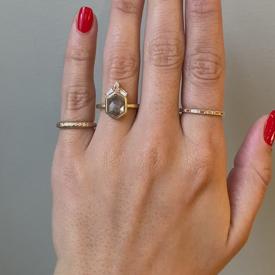 Arwen is the dream team you have been searching for all this time.  Her combination of 14k yellow gold, baguettes, pears and hexagon is just the perfect mix. The 2ct Grey rough diamond in a long hexagon shape is super rare and not one to pass up.