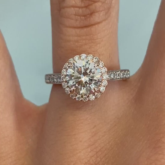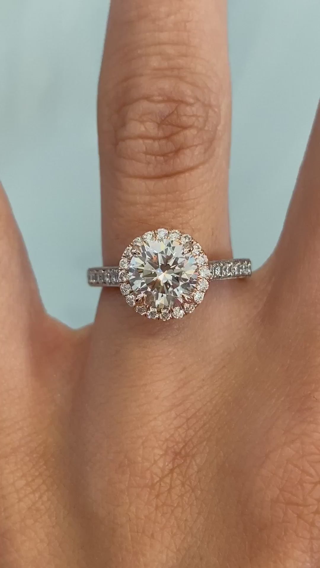 Maive is different - something simple, sweet, and elegant all rolled into one. Her heart is set with a wondrous round cut diamond which is nestled in a beautifully designed 14k rose gold halo, which segues into a platinum pavé band.  The combination of platinum and rose gold makes this classic design unique. She is a very special piece - don't let her pass you by. Handmade in NYC.  Also available with yellow gold halo.