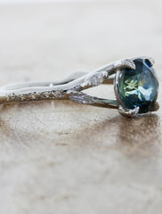 Eliza is simply put nature in jewelry form. An amazing round cut Montana blue/green sapphire sits like a queen in the center of this 14k white gold band: set in a classic 4-prong setting, but with a leafy hand engraved twist and stunning marquis diamonds that say hello every time you look at them.